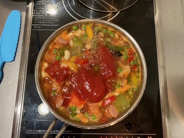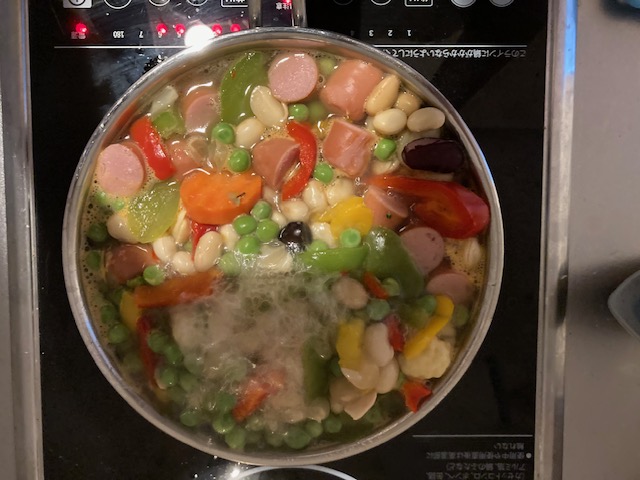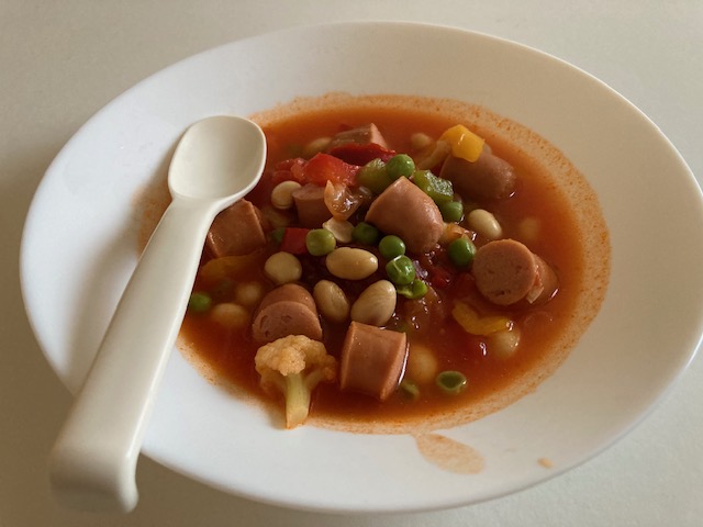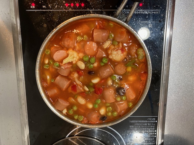 In my case, there is no specific recipe. Just putting all the ingredients in the pot. Boil them with an amount of water. Ingredients: Green peas, boiled soybeans, red peppers, green peppers, yellow peppers, sausages, cauliflower, broccoli, carrots, kidney beans.